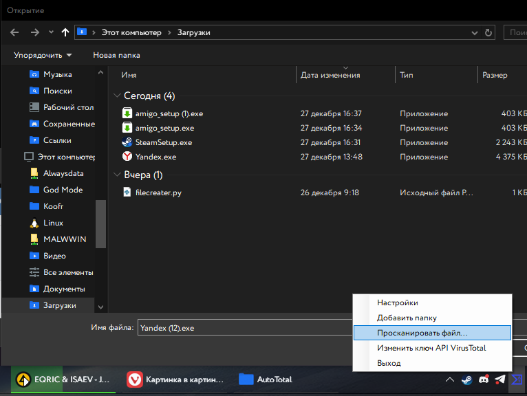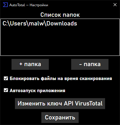 AutoTotal — это программа для автоматического сканирования файлов из папки "Загрузки" (и не только) на VirusTotal.