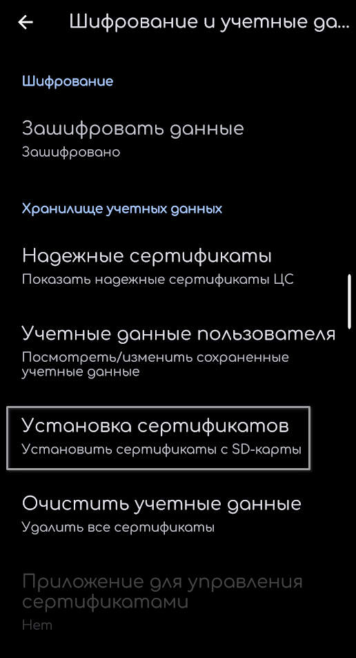 - В разделе "Шифрование и учетные данные" будет кнопка "Установка сертификатов".