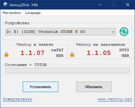 В архиве есть 3 приложения: Ventoy2Disk, VentoyPlugson, VentoyVlnk. Для создания флешки с Ventoy запустите Ventoy2Disk. Выберите флешку из списка и нажмите Установить.