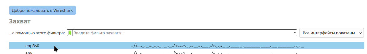 - Выберите сетевой интерфейс для захвата трафика. В моём случае это