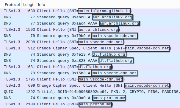 На этих системах проще всего использовать Wireshark. Он отслеживает весь трафик на устройстве. Он отображает SNI из пакетов ClientHello и обращения к DNS-серверу.