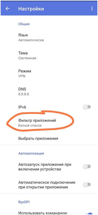Есть возможность настроить приложение так, чтобы ByeByeDPI игнорировал некоторые приложения или работал только с определёнными приложениями. Для этого в настройках (слева вверху) нажмите "Фильтр приложений", выберите черный или белый список соответственно.
