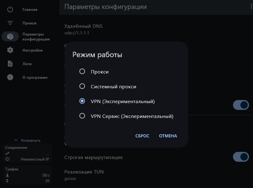 - Выберите режим "VPN (Экспериментальный)" или "Tun".