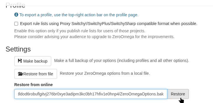 Для импорта настроек от Tor Portable, перейдите на вкладку "Import/Export", найдите текстовое поле "Options file URL" и вставьте ссылку на конфигурацию, затем нажмите Restore.