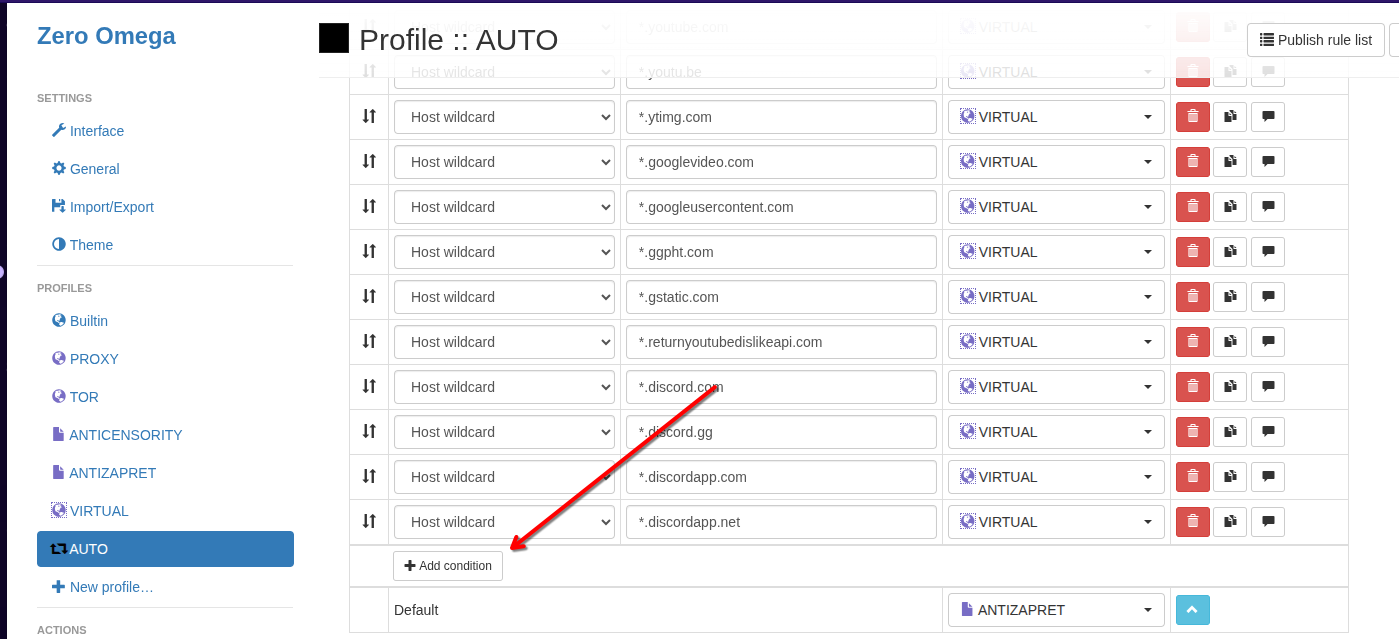 Добавление сайта в список AUTO в Zero Omega