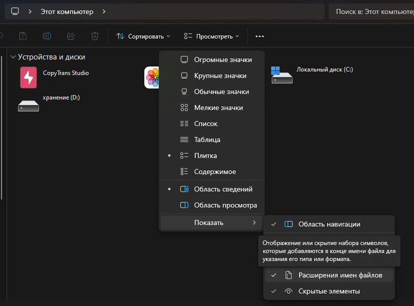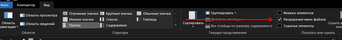- Выберите вкладку "Вид" и поставьте галочку на настройке "Расширения имён файлов"