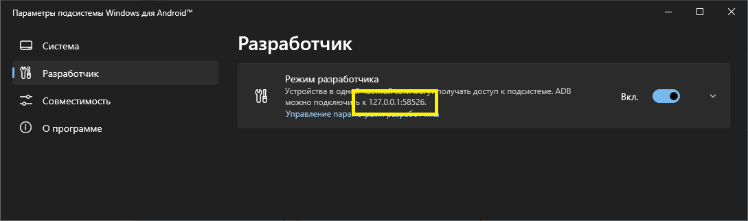 Откройте "Параметры подсистемы Windows для Android" (найдите в Пуске), перейдите во вкладку Разработчик, включите Режим разработчика.